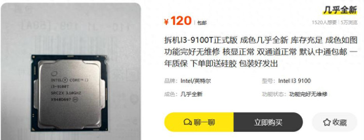当今要是要装新机的话,比拟昨年最少要多花三分之一的钱,是以要是能忍的话,如故再等等吧,简直急用暴戾去二手鱼淘一套济急的电脑,我看到个卖家挂出来一批拆机的I3-9100T郑再版CPU,标价120元,库存弥散,成色险些全新,还带一年质保。以这个处理器为中枢,装一套二手电脑,性能够用,并且也花不了几许钱。